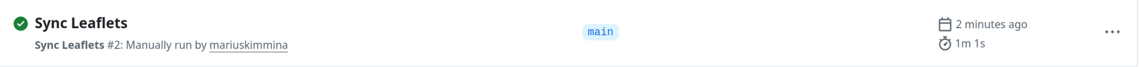 After I press publish on a Leaflet I go to my homepage repo on Github and I trigger a pipeline, this pipeline will run leaflet-hugo-sync and directly update the main branch of the repo. Once it finishes all my leaflets can be found as up to date markdown files in the repo.